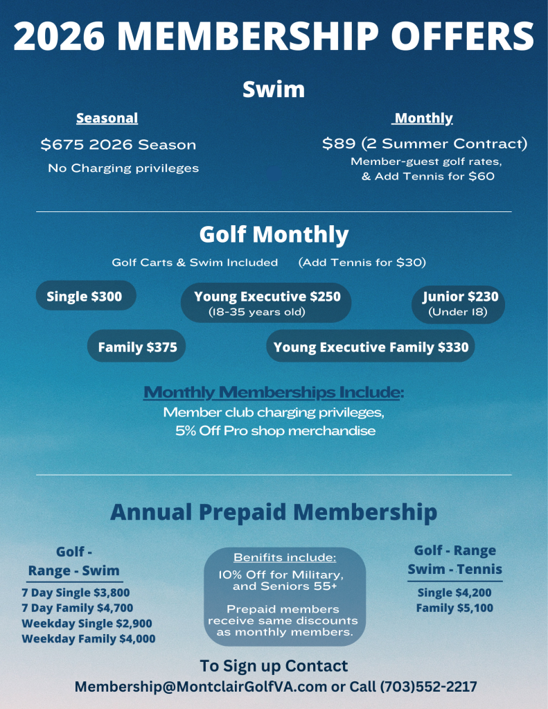 We invite you to schedule a visit or contact our Membership Director today to learn more about membership opportunities at Montclair Golf Club in Prince William County, Virginia. Come see why so many families choose Montclair as their home away from home.