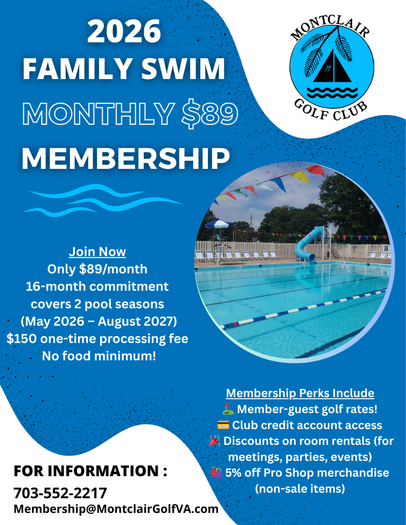 Cool off and make lasting memories with a Swim Membership at Montclair Golf Club in Prince William County, Virginia. Our Junior Olympic-sized pool, relaxing atmosphere, and friendly service make Montclair the perfect destination for summer fun.